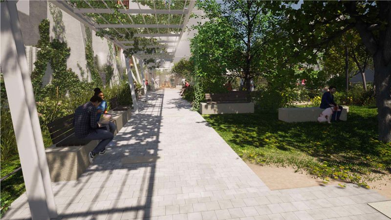 Mais un jardin c’est aussi des espaces préservés, plus confidentiels, protégés par des végétaux jouant le rôle de cloisons ou paravents avec du mobilier conçu à partir des pierres récupérées dans le cadre de la démolition des bâtiments existants. Une pergola, installée le long des murs pignons des immeubles bordant le lieu, viendra abriter la déambulation piétonne et apporter une ombre bienvenue lors des après-midis d’été.