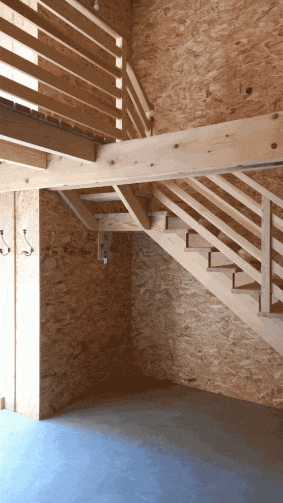 De même, le choix a été fait de réaliser les cloisons intérieures en bois, avec finition OSB.
