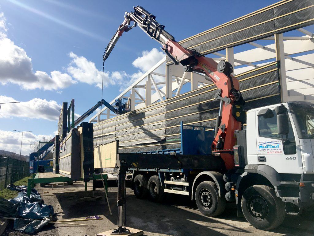 Si l’entreprise Martignat a pu boucler ce chantier de construction bois en moins de trois mois, c’est qu’elle a su mettre à profit sa proximité avec le lieu de réalisation du bâtiment pour réaliser un maximum d’éléments en préfabrication dans ses ateliers en même temps qu’elle a su optimiser ses capacités de production et de mise en œuvre.