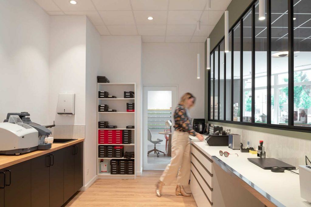 Cela a par exemple été le cas pour l’aménagement du centre optique de La Fouillouse, un projet développé à partir d’un plateau de 160 m2 en pied d’immeuble d’habitation neuf et comprenant à la fois un atelier et un espace de vente. « Tout était à concevoir. Nous avons géré l’ensemble du chantier, depuis les démarches administratives jusqu’à la livraison », indique Maxence Guyon.