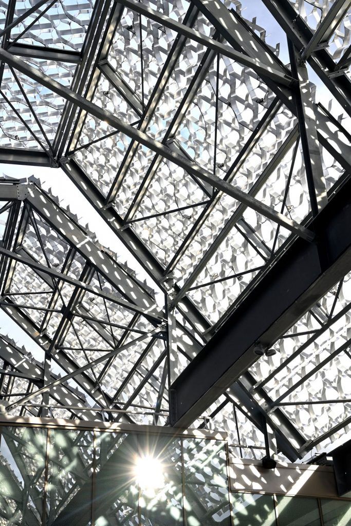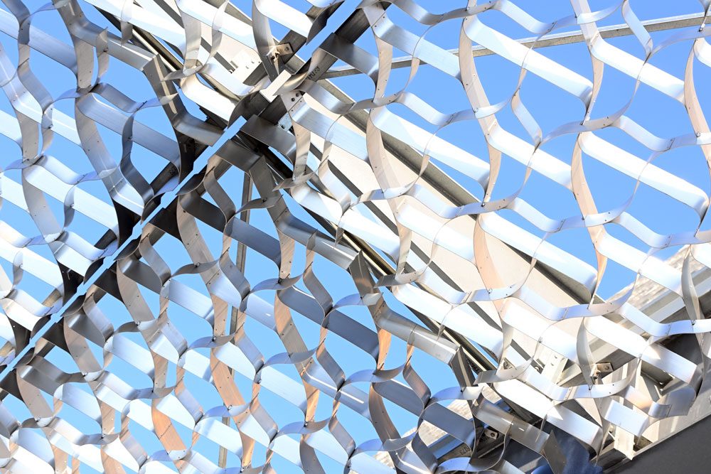D’emblée les designers ont opté pour le choix de l’aluminium un matériau qui peut jouer avec la lumière et qui présente des propriétés physiques intéressantes (résistant aux aléas climatiques, recyclable à l’infini) mais aussi esthétiques. Il y avait enfin une question cruciale à prendre en compte, le poids, car cette enveloppe ajourée couvre 30 000 m2.